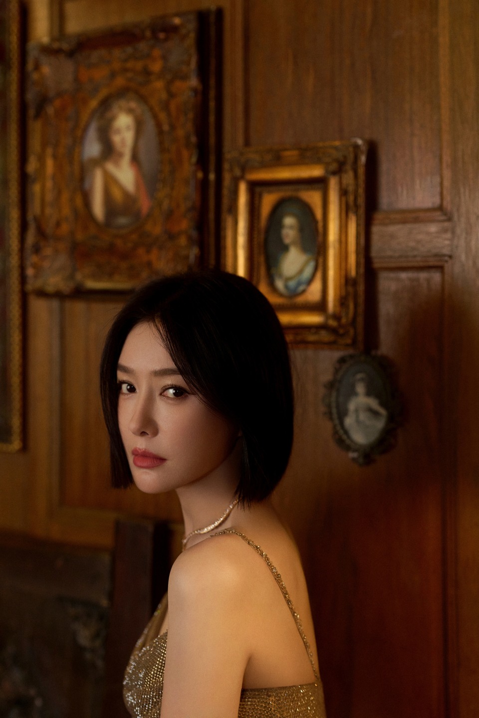 秦岚一袭金色长裙融于古典画镜 尽显缱绻优雅