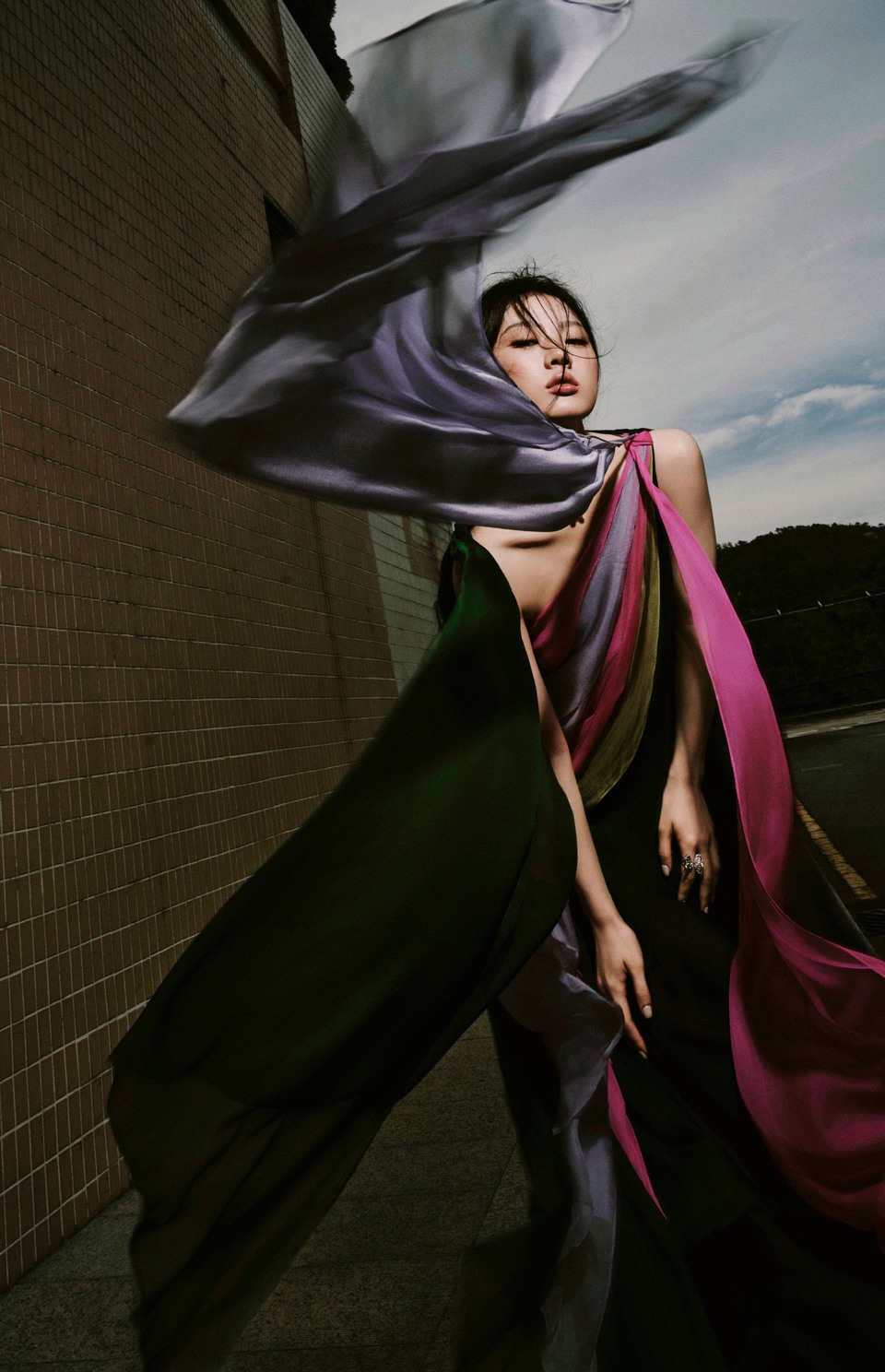 单依纯柔纱翩跹虹丝纷飞 侧影裙摆随风飘