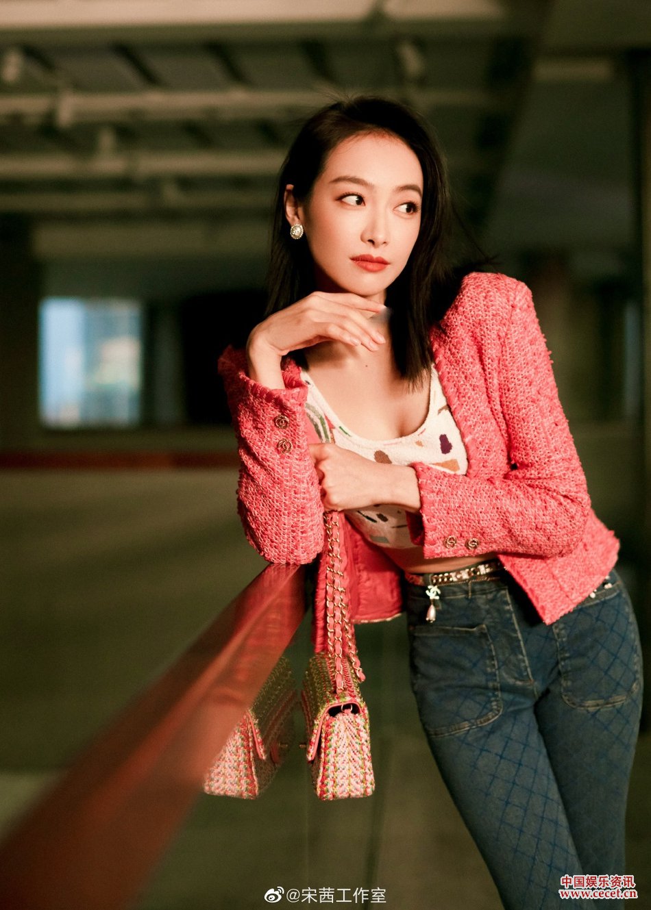 宋茜玫瑰外套干练优雅 露出腹肌大秀好身材