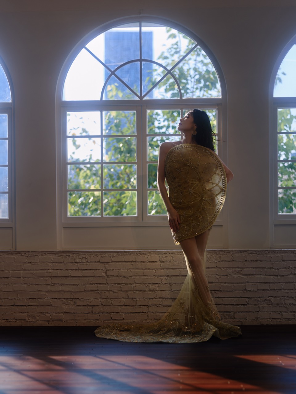 迪丽热巴暗夜深邃长裙缀满细闪星