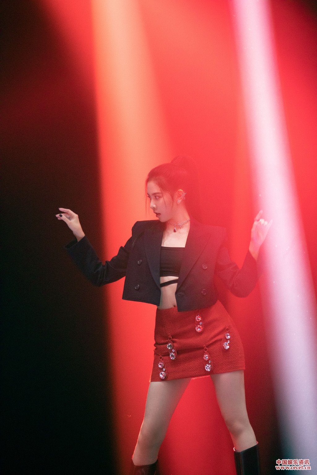 宋妍霏黑衣红裙 酷飒的高马尾闪耀个性光芒