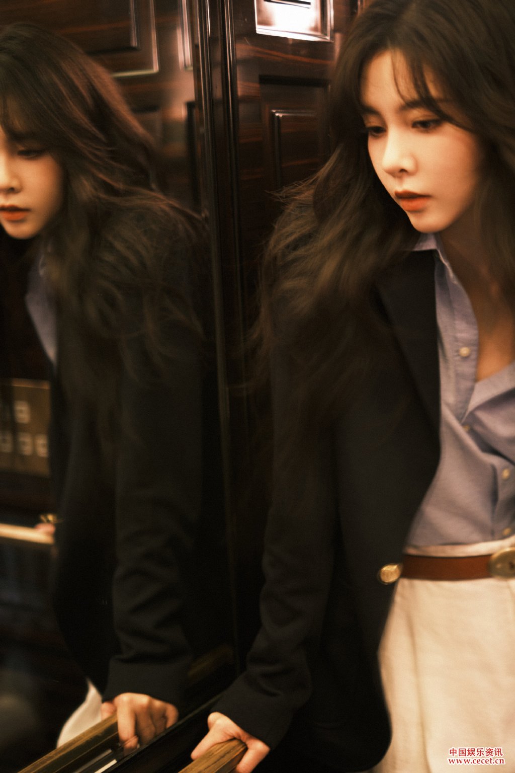 宋妍霏黑色外套搭配蓝色衬衣简约利落尽显个性