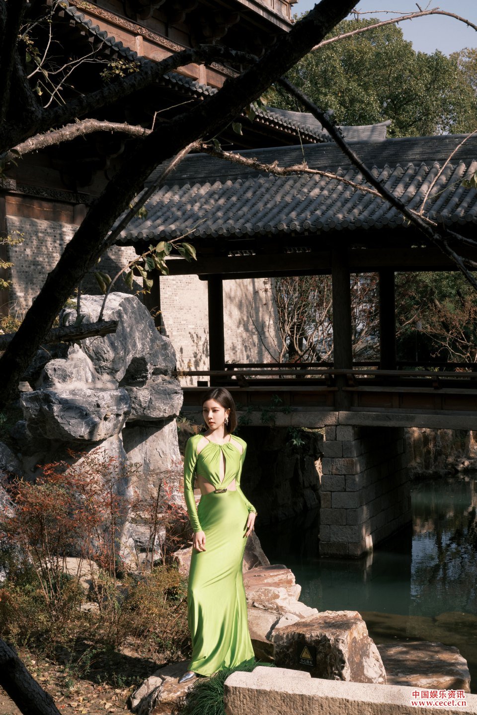 宋妍霏绿色丝绸设计感礼服 婆娑弄碧璀璨琳琅