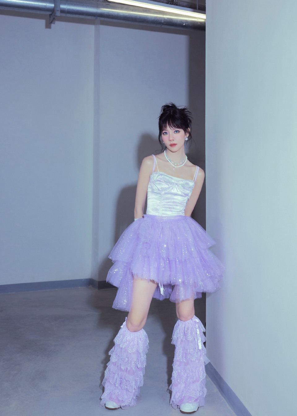 宋妍霏缎带绕肩紫纱叠层 俏皮灵动诠释满分少女力
