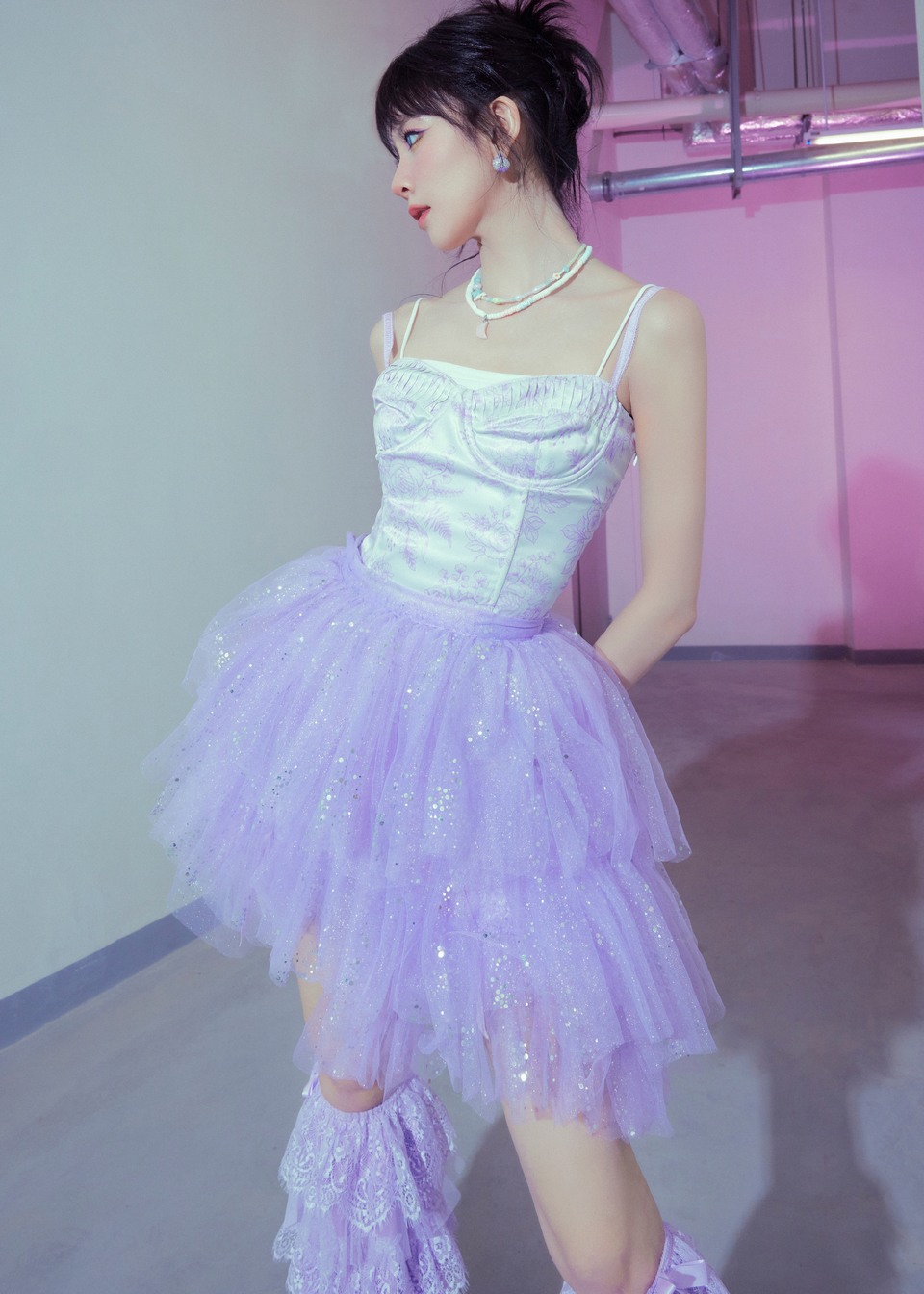 宋妍霏缎带绕肩紫纱叠层 俏皮灵动诠释满分少女力