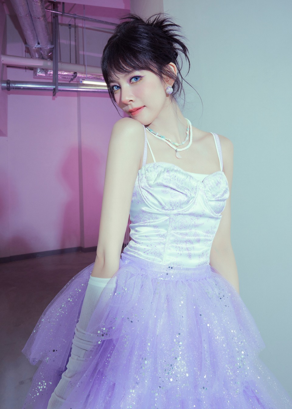 宋妍霏缎带绕肩紫纱叠层 俏皮灵动诠释满分少女力