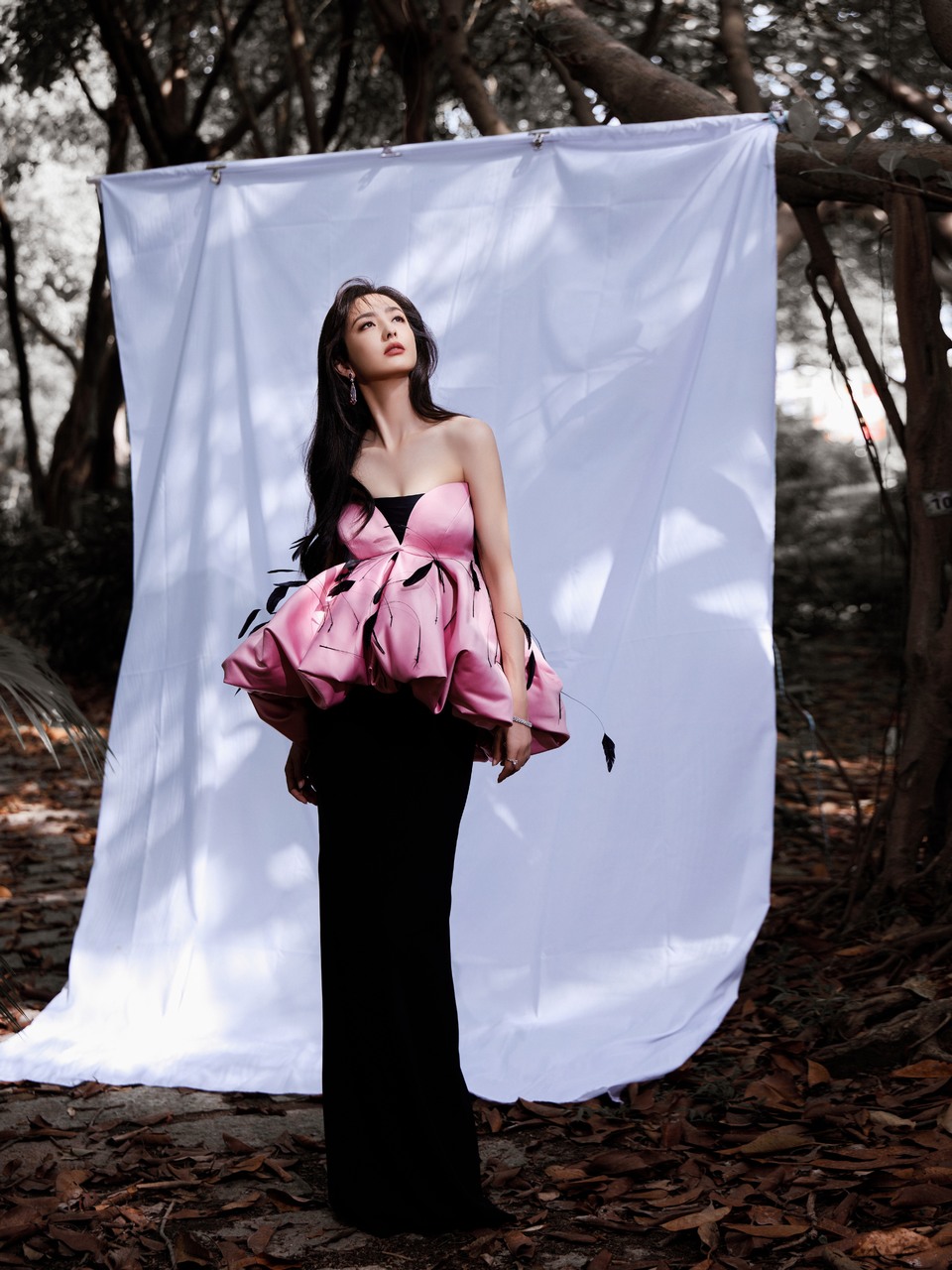 关晓彤身穿粉色花卉薄纱抹胸拖尾