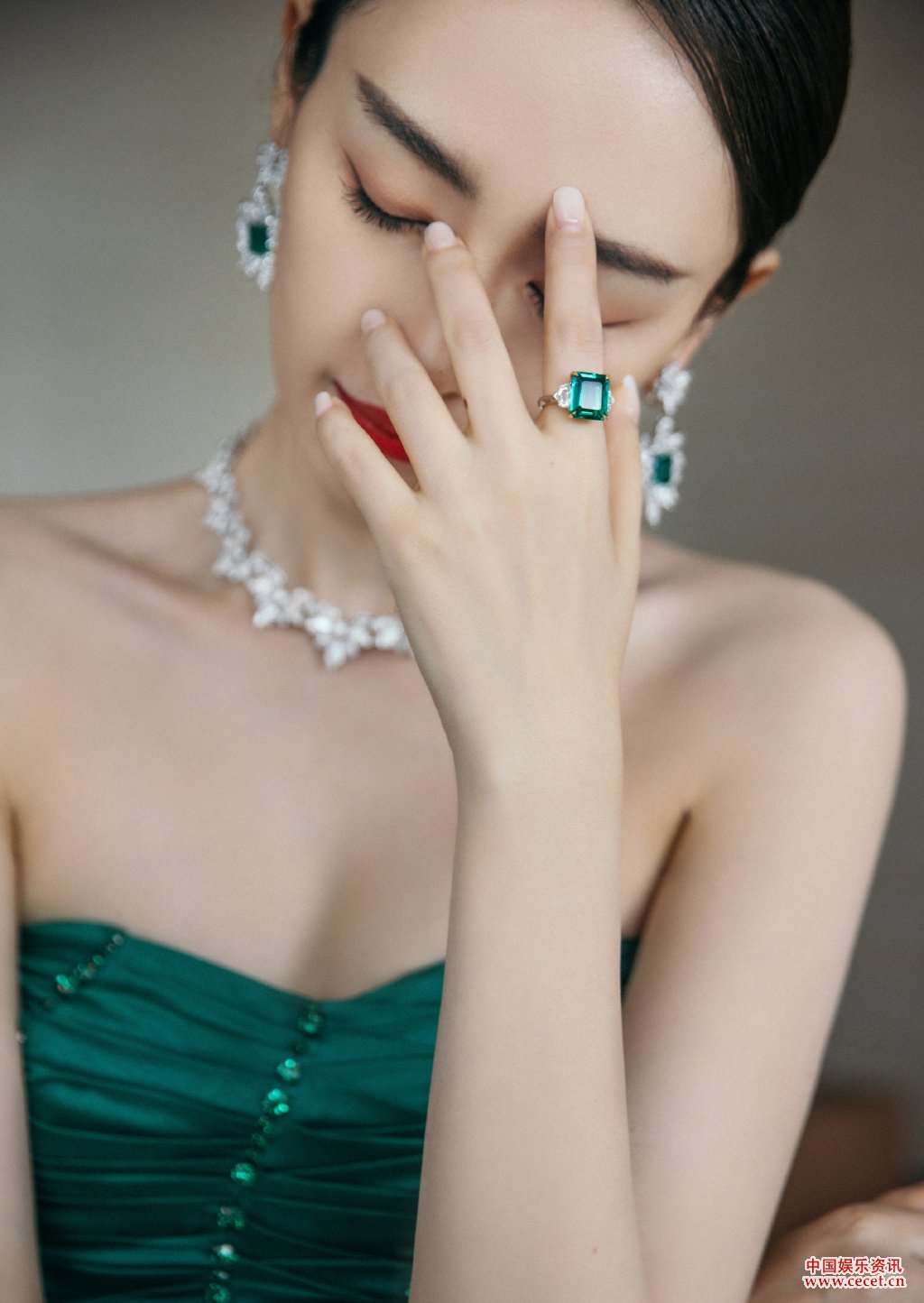 童瑶墨绿色丝绸抹胸长裙 优雅唯美尽露摩登之感