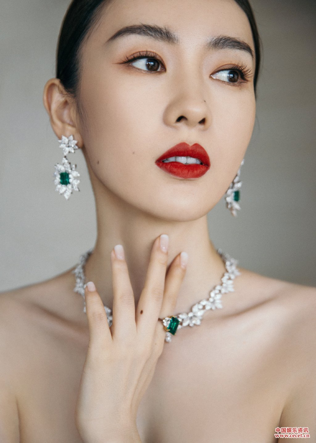 童瑶墨绿色丝绸抹胸长裙 优雅唯美尽露摩登之感