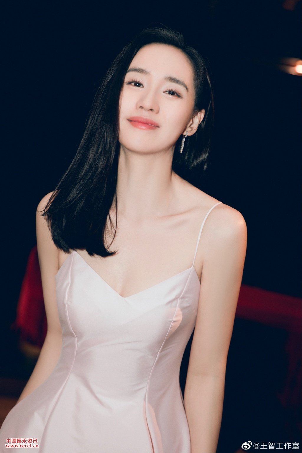 王智淡粉吊带礼服亮相 秀发拂肩优雅迷人