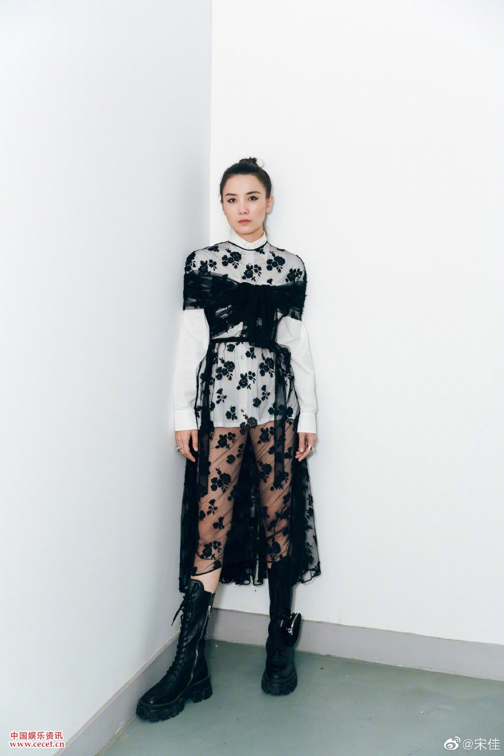 宋佳身着黑白蕾丝绑带纱裙 造型依然超飒