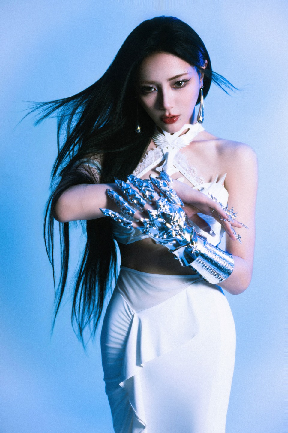 谢可寅银臂环若星芒缀饰 白色长裙似云霭摇曳梦幻涟漪