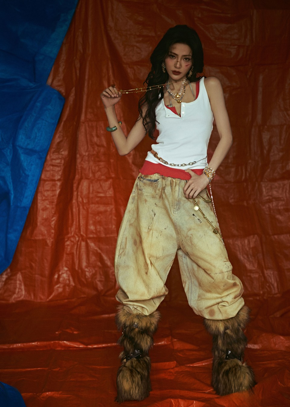 谢可寅珍珠与金属层叠缠绕 腰间银链随节奏摆动