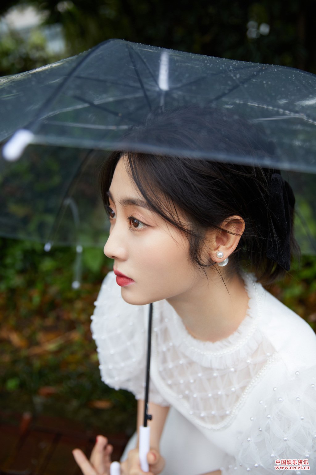 邢菲法式珍珠白裙置身绿意之间 释放柔情蜜意