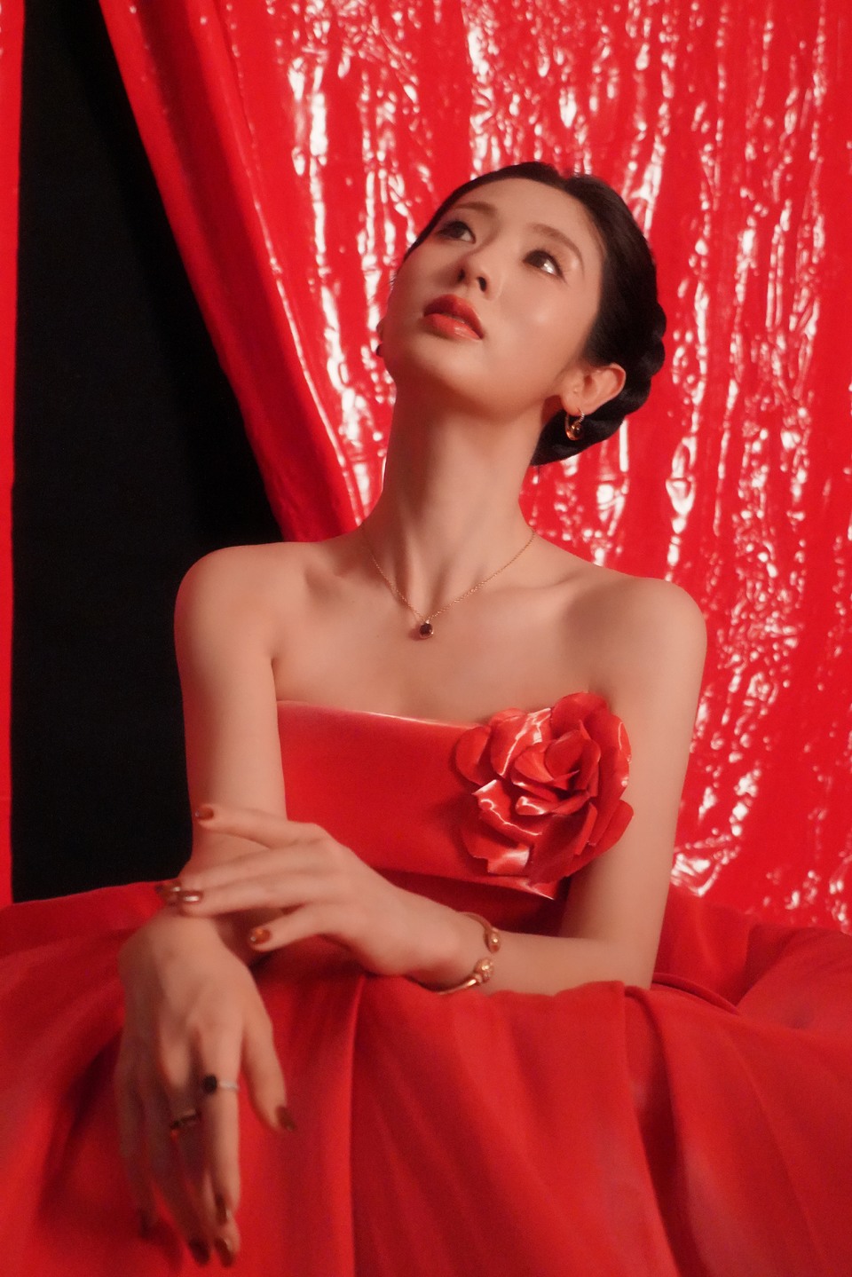 邢菲冬日玫瑰明艳动人 红缎流光风华尽显