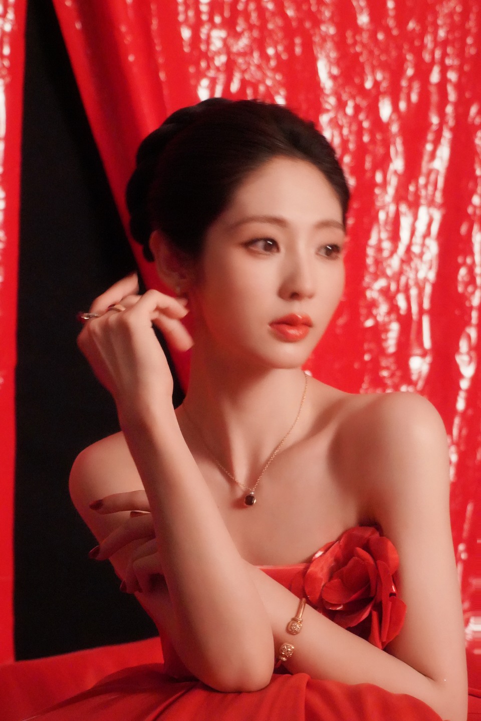 邢菲冬日玫瑰明艳动人 红缎流光风华尽显