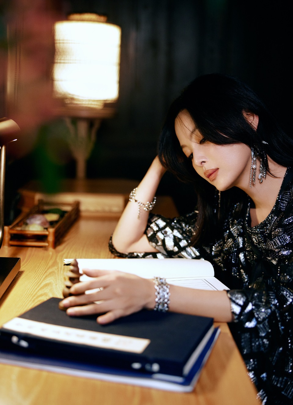 辛芷蕾身穿刺绣斗篷揽风荷 移画入景境无止境