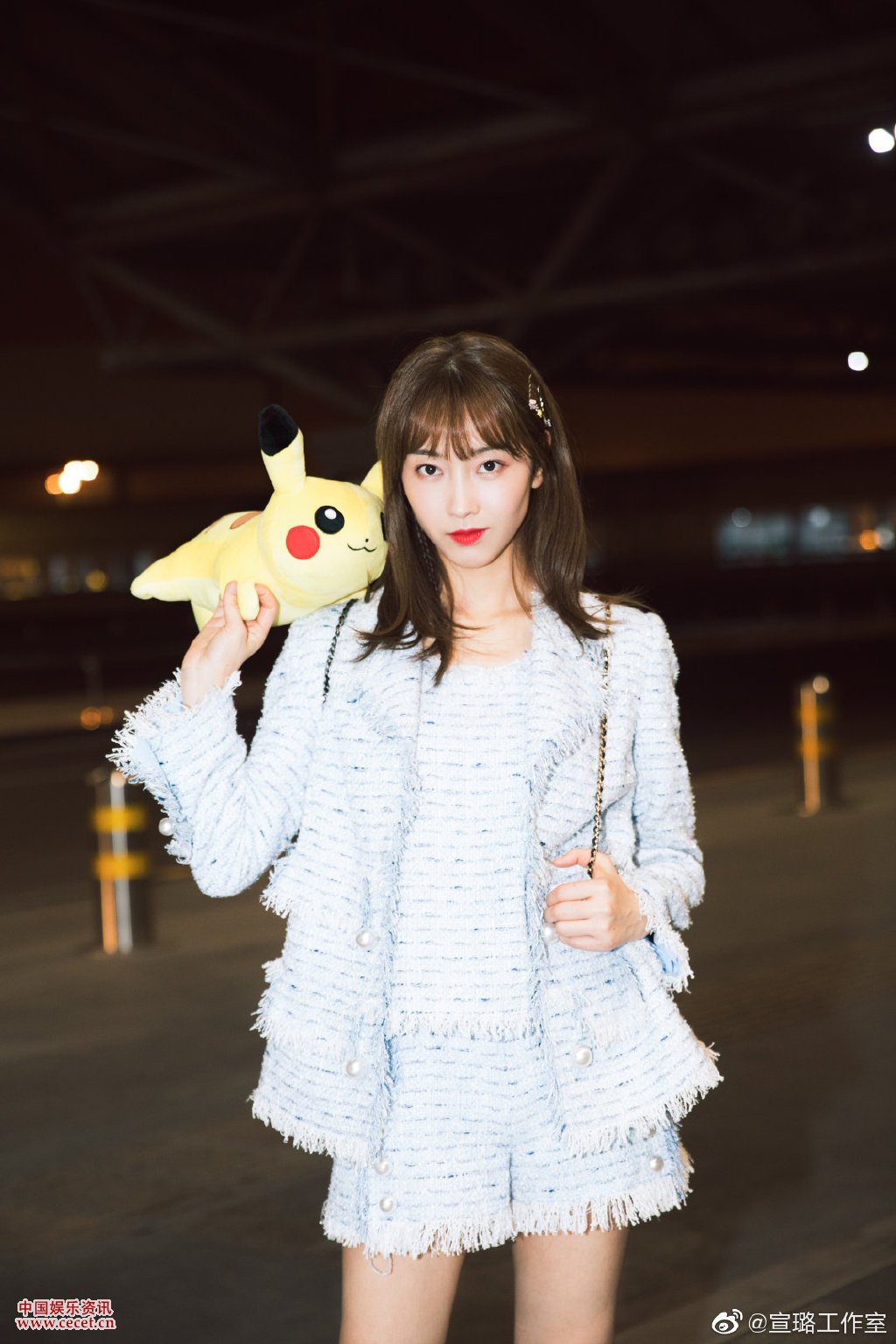 宣璐手拿超萌皮卡丘玩偶 蓝色清爽look现身