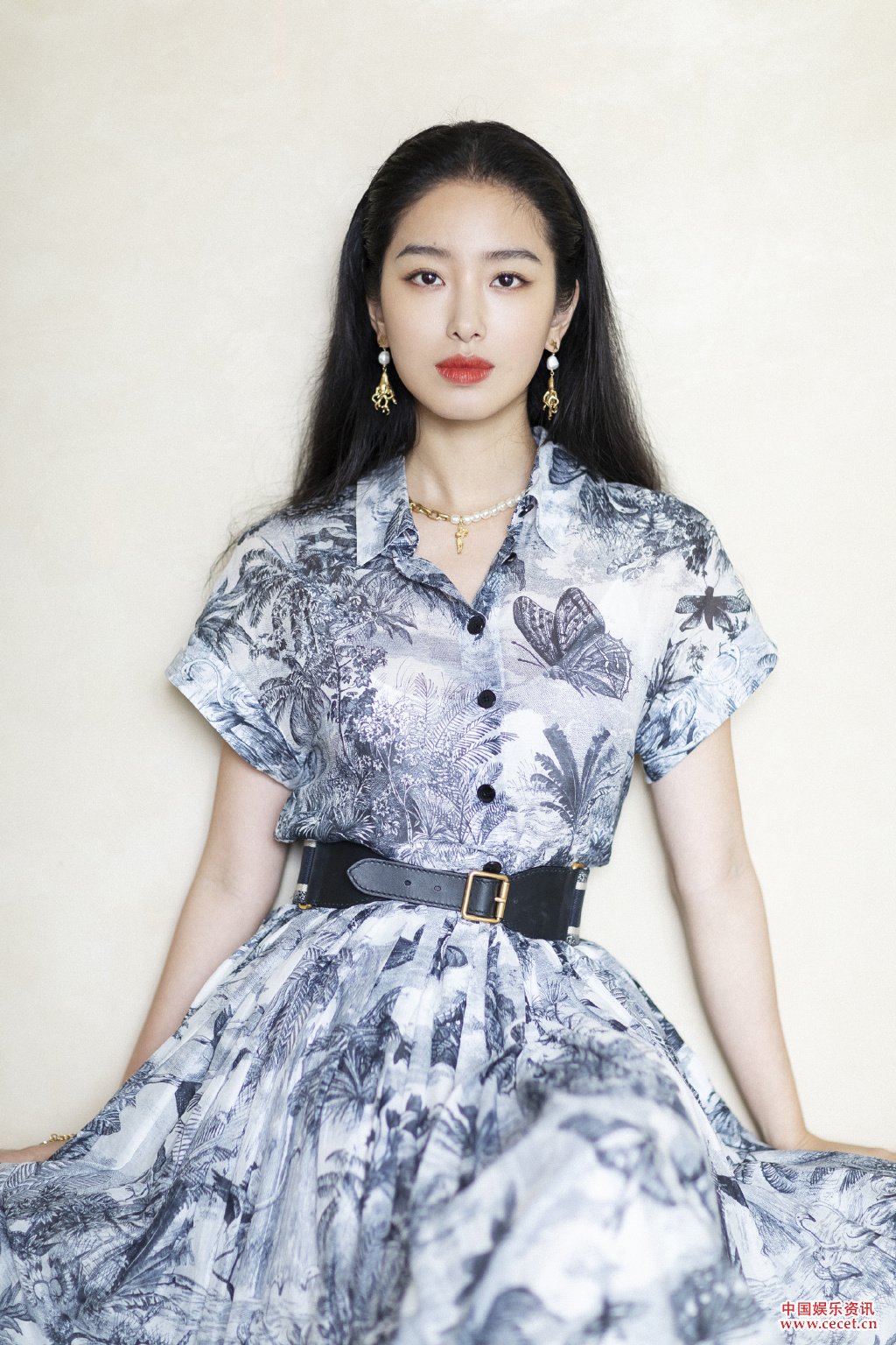 杨采钰海军蓝印花剑褶裙 黑发披肩随性优雅