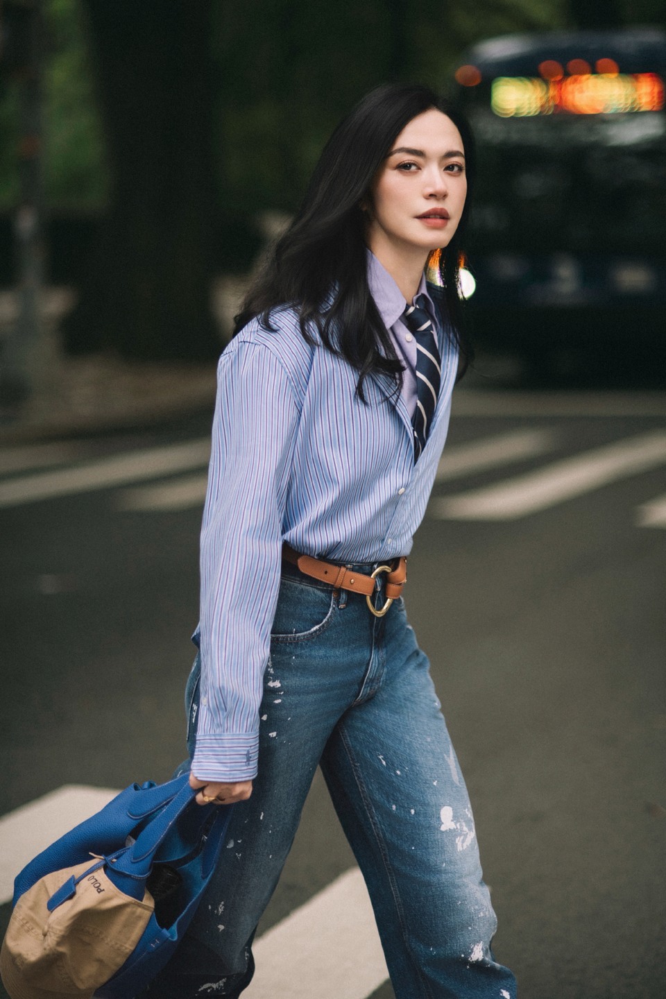 姚晨在街头走走停停间 复古与酷飒气息萦绕
