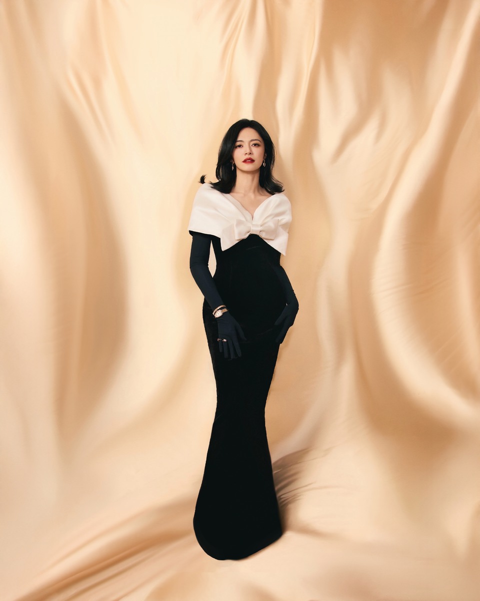 姚晨粉缎如霞衬出黑白隽永 礼裙飘逸于绮丽的粉雾中