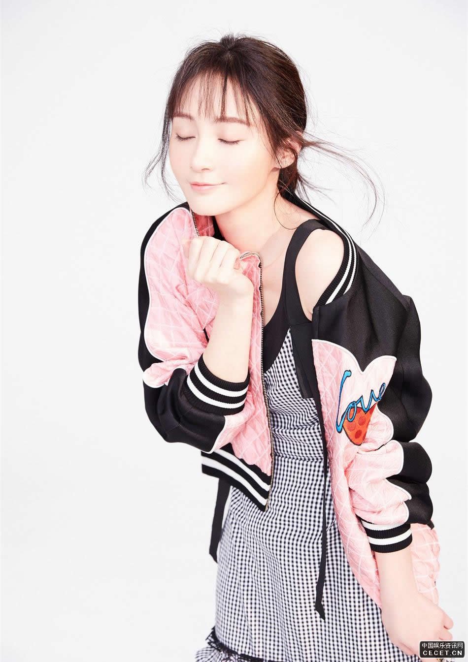 姚笛千鸟格吊带裙写真 梳空气刘海活力满满