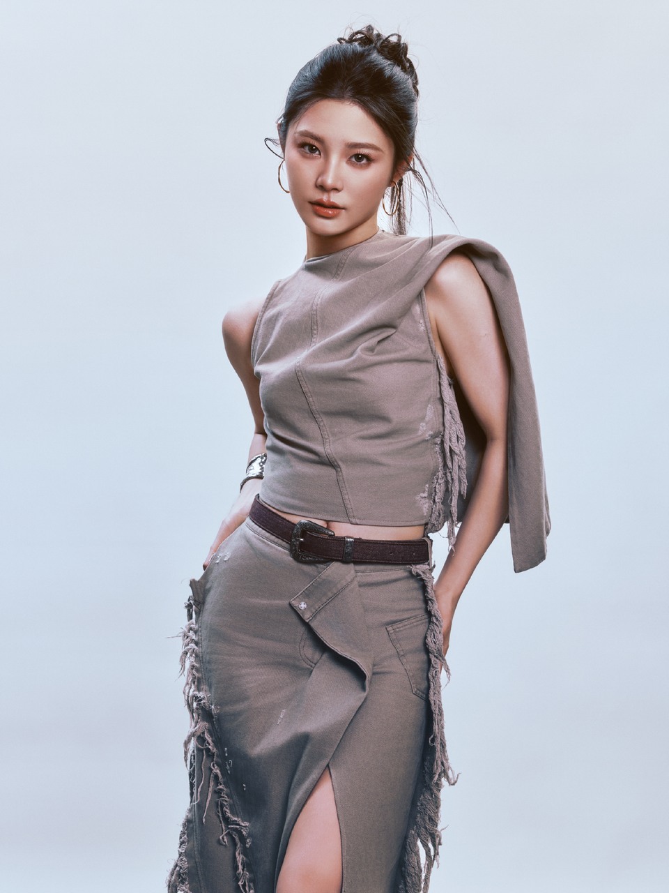 江疏影在蓝色条纹与背景画布的慵