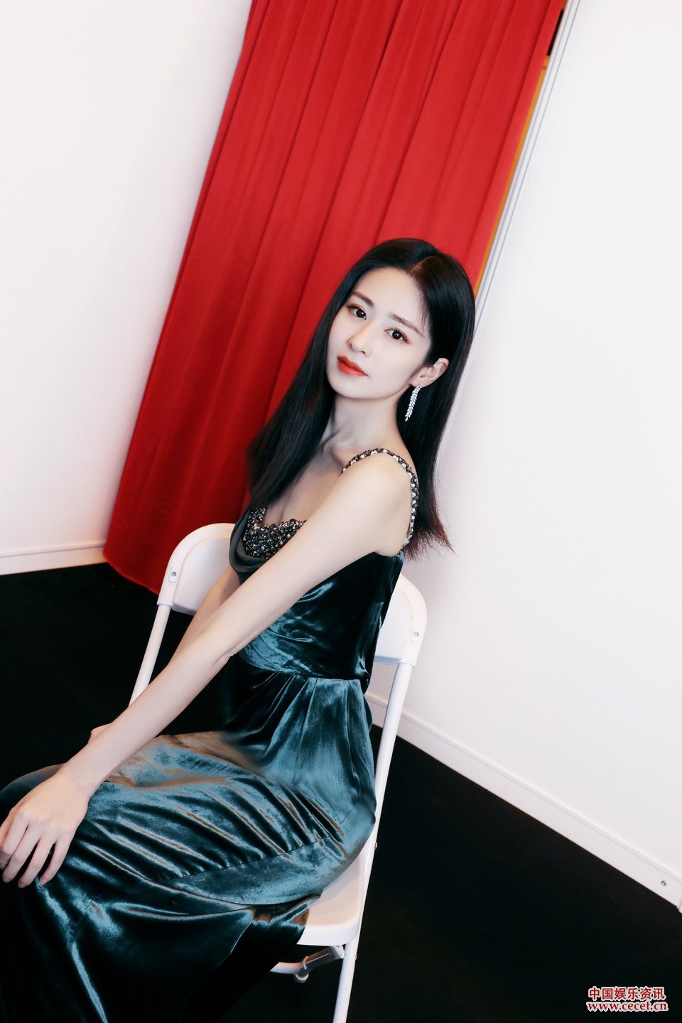 颖儿身穿墨绿色吊带长裙 肩颈线勾勒雅致浪漫