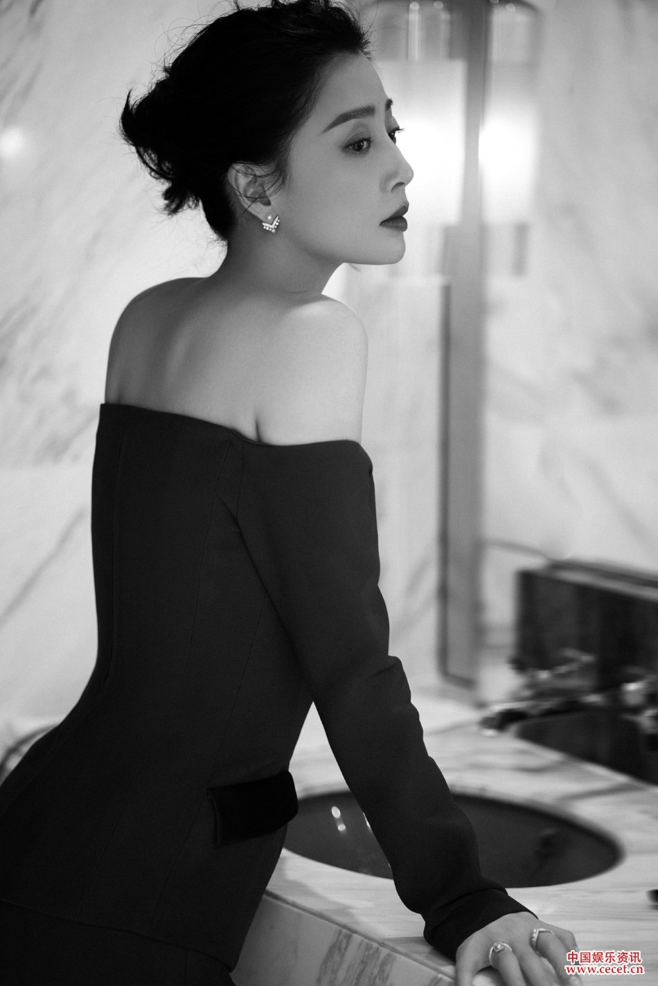 殷桃雨中撑伞漫步街头 一字肩西装套装潇洒利落