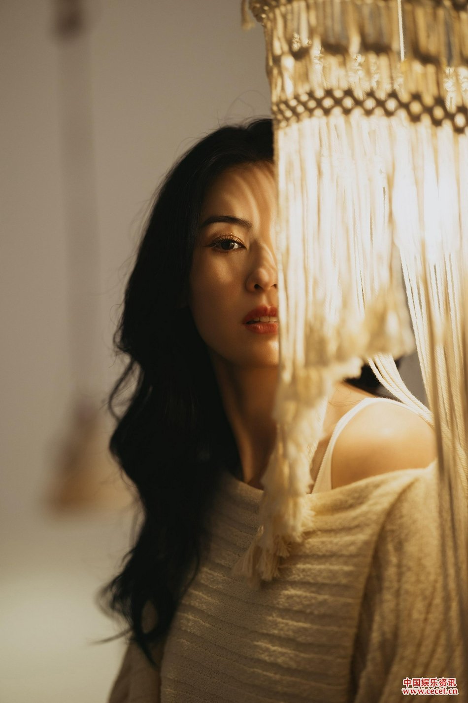 张柏芝白色休闲毛衫驻足流苏灯前优雅闲适