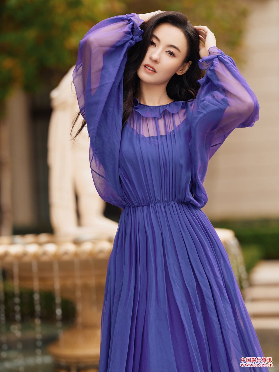 张柏芝紫色长纱裙随拍 悠然自处共赴浪漫之约
