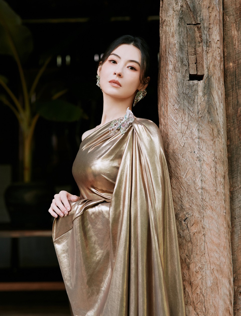 童瑶一袭米金曳地长裙