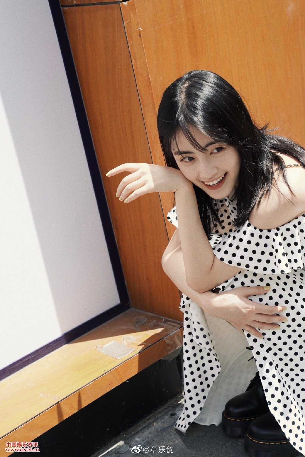 章乐韵露肩连衣裙大片 对镜甜笑少女感满满