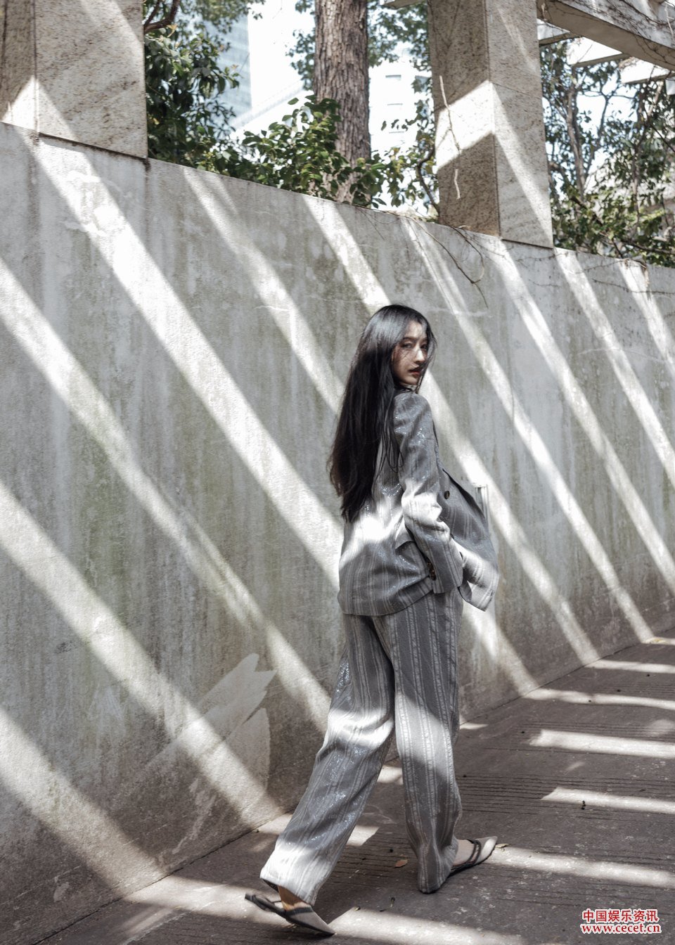 张俪一身雅致西装邂逅隽美春光 温柔诠释坚韧