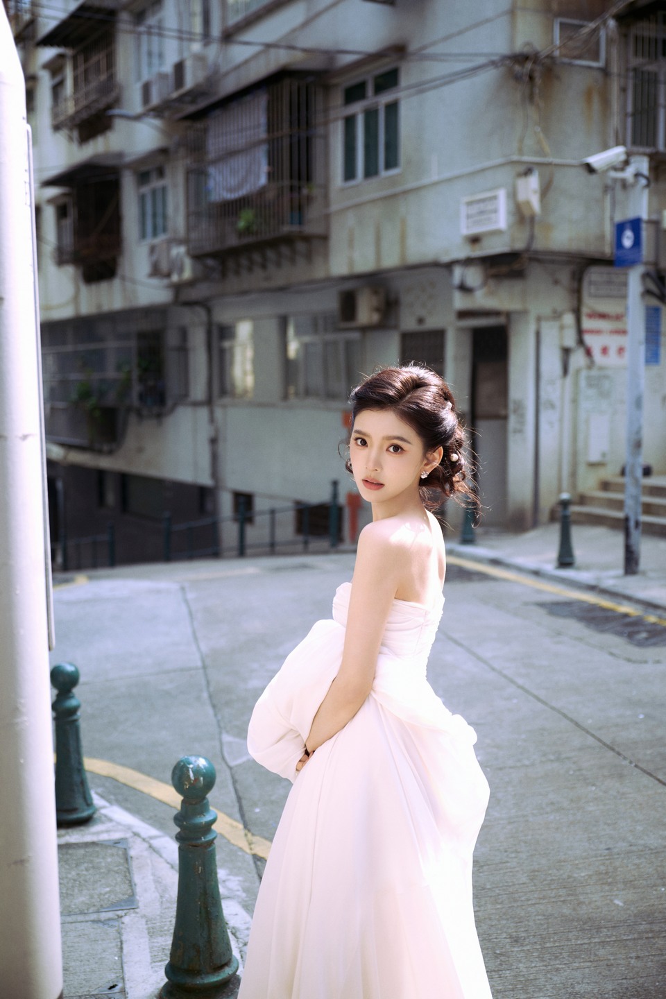 章若楠街巷回眸纯白明媚 微风裹着细碎暖意漫过肩头