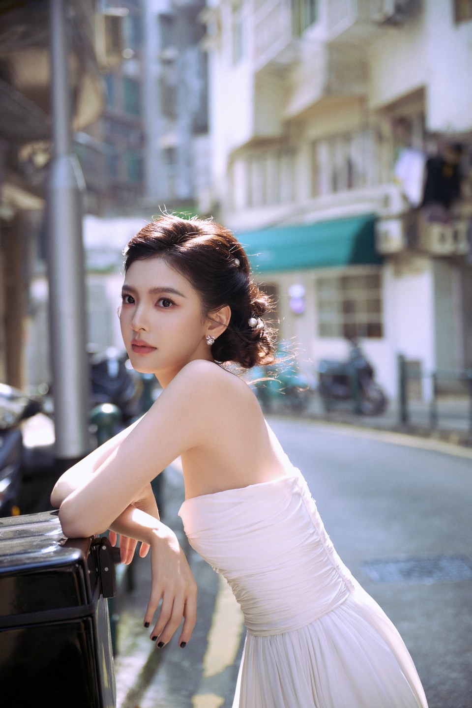 章若楠街巷回眸纯白明媚 微风裹着细碎暖意漫过肩头