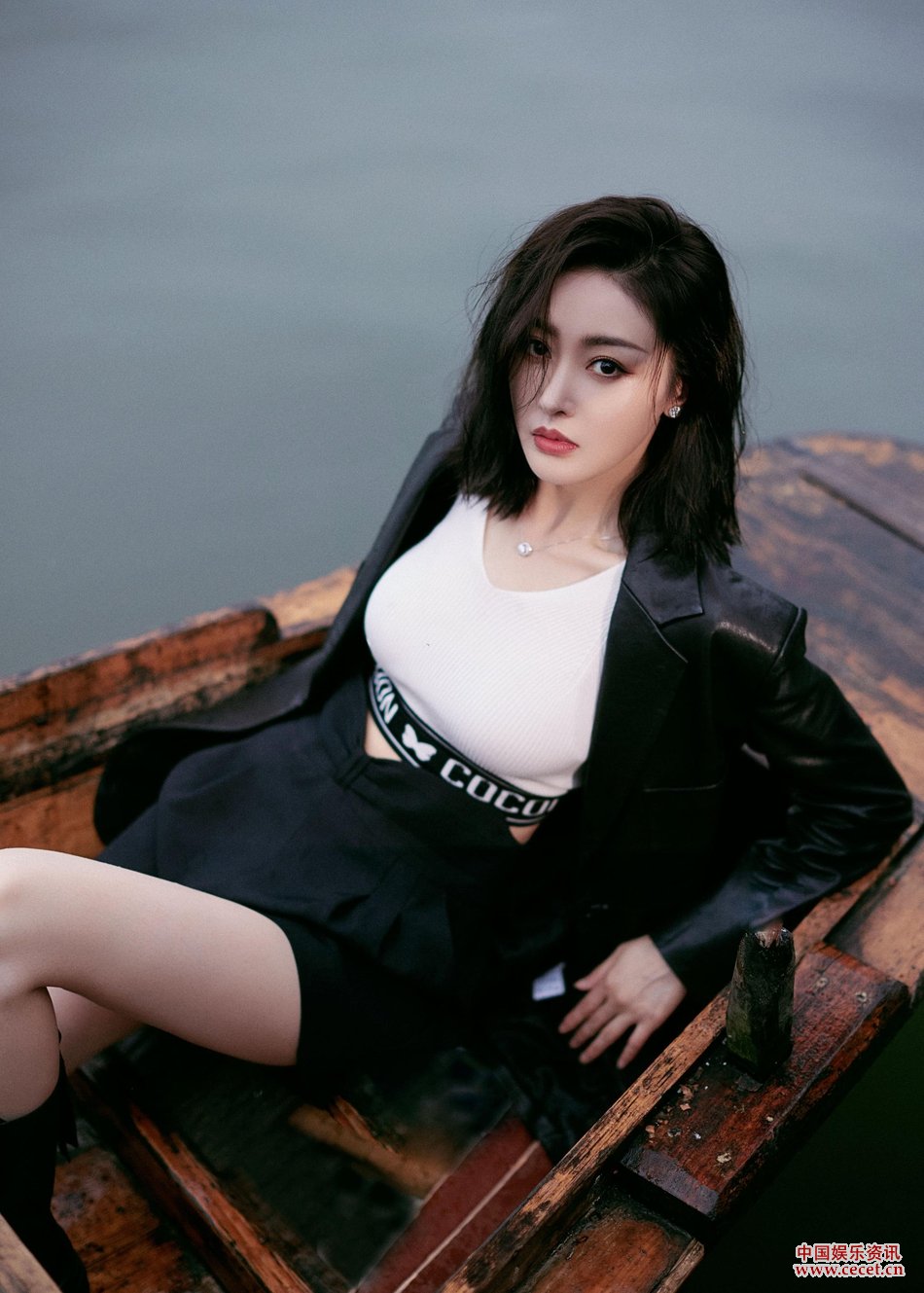 张天爱黑皮衣西湖大片 神色冷峻透出强大气场