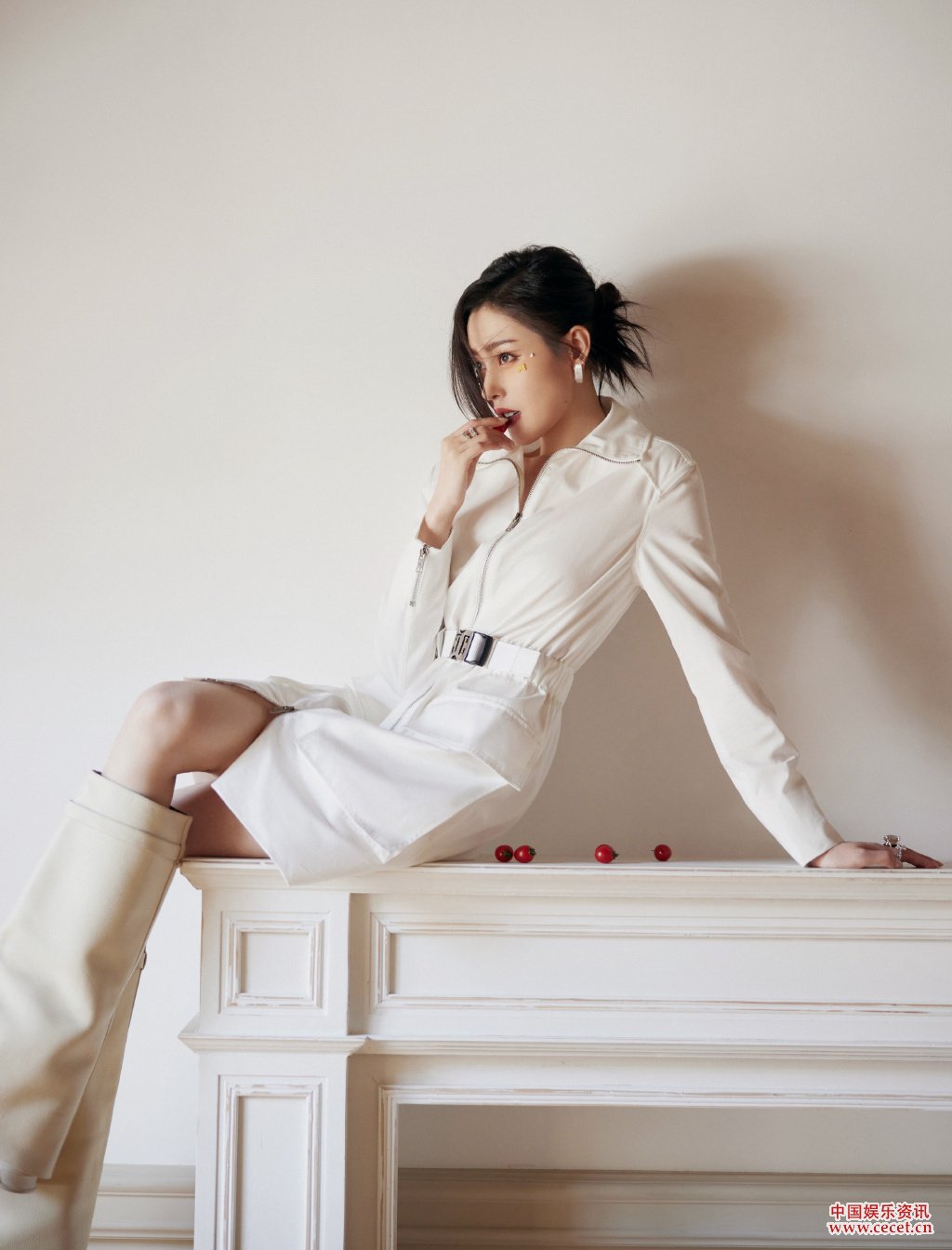 张天爱白衣长靴经典搭配 纯白轮廓彰显洒脱姿态