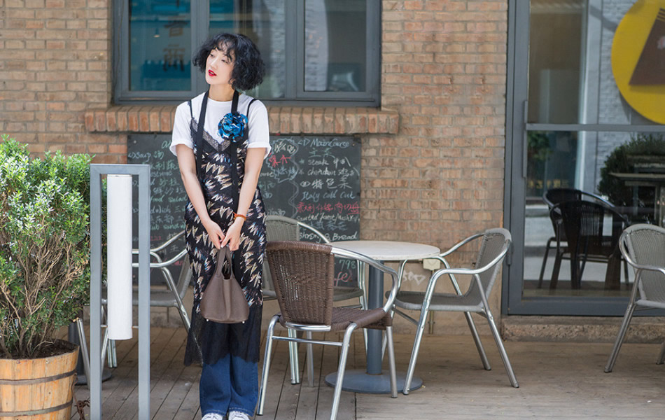 张瑶下搭牛仔喇叭裤照 整身LOOK都飘逸活泼