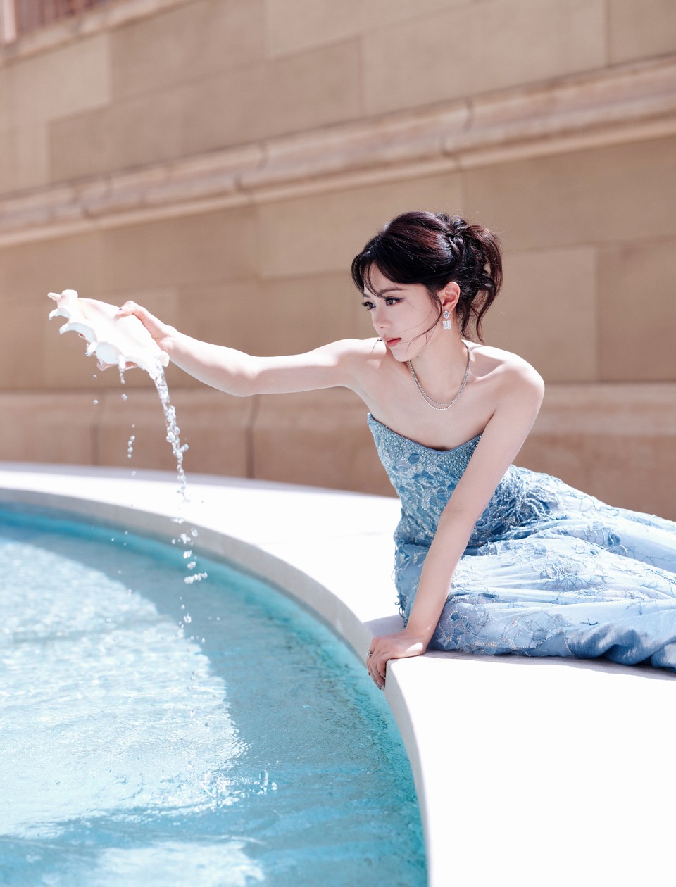 赵今麦水池边水波光影 蓝光倾泻炽热流动