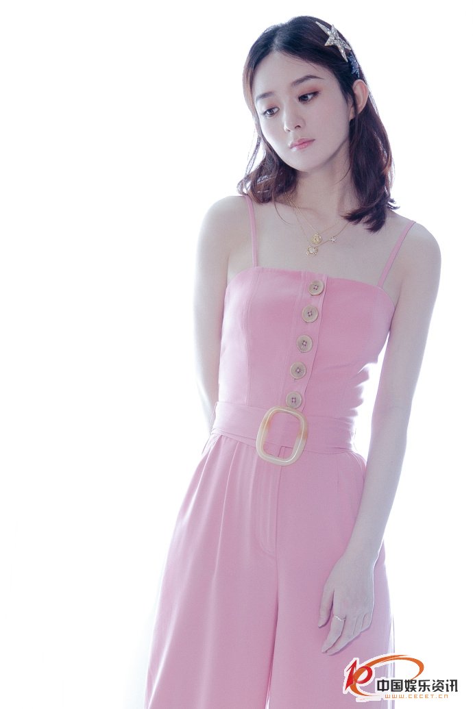 赵丽颖粉色连体裤照 头戴星星发卡甜美动人