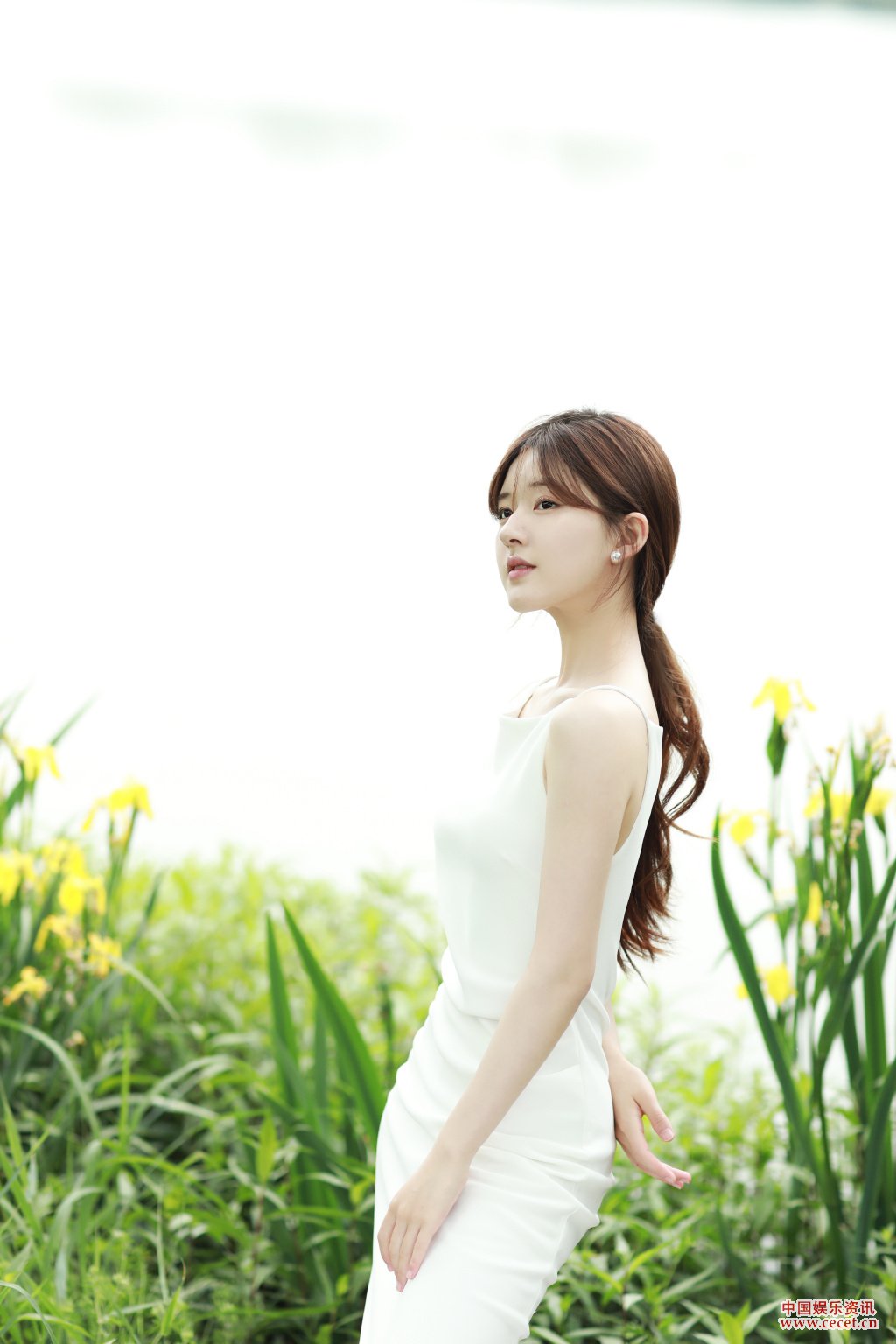 赵露思白裙置身菏塘边 梳着马尾辫清爽活力