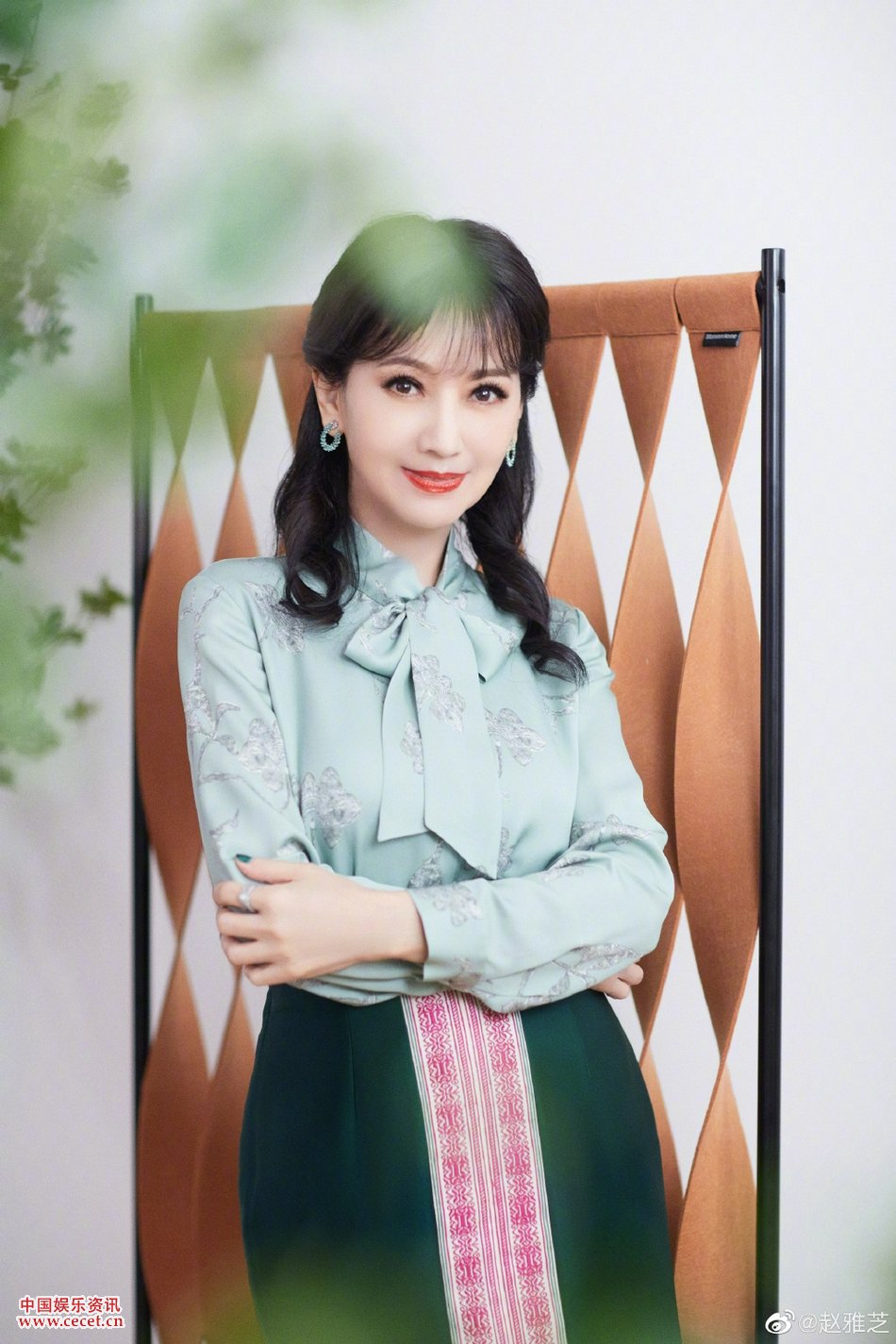 赵雅芝深绿裙子写真 卷发披肩尽显优雅端庄