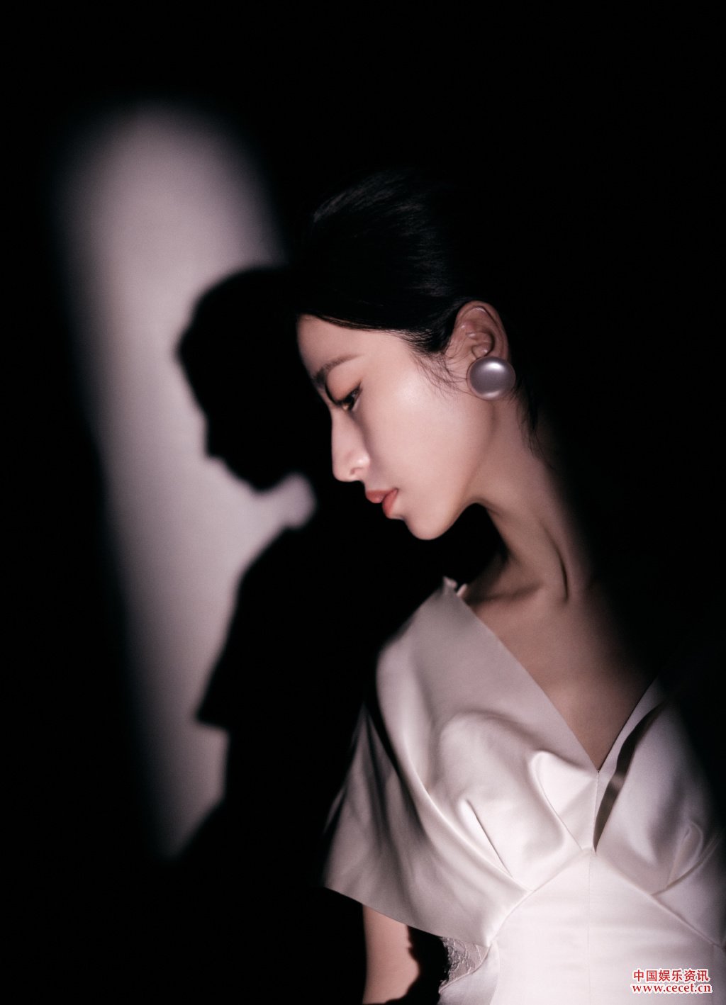 周雨彤长款拖地礼服照 幽暗的空间更显神秘感