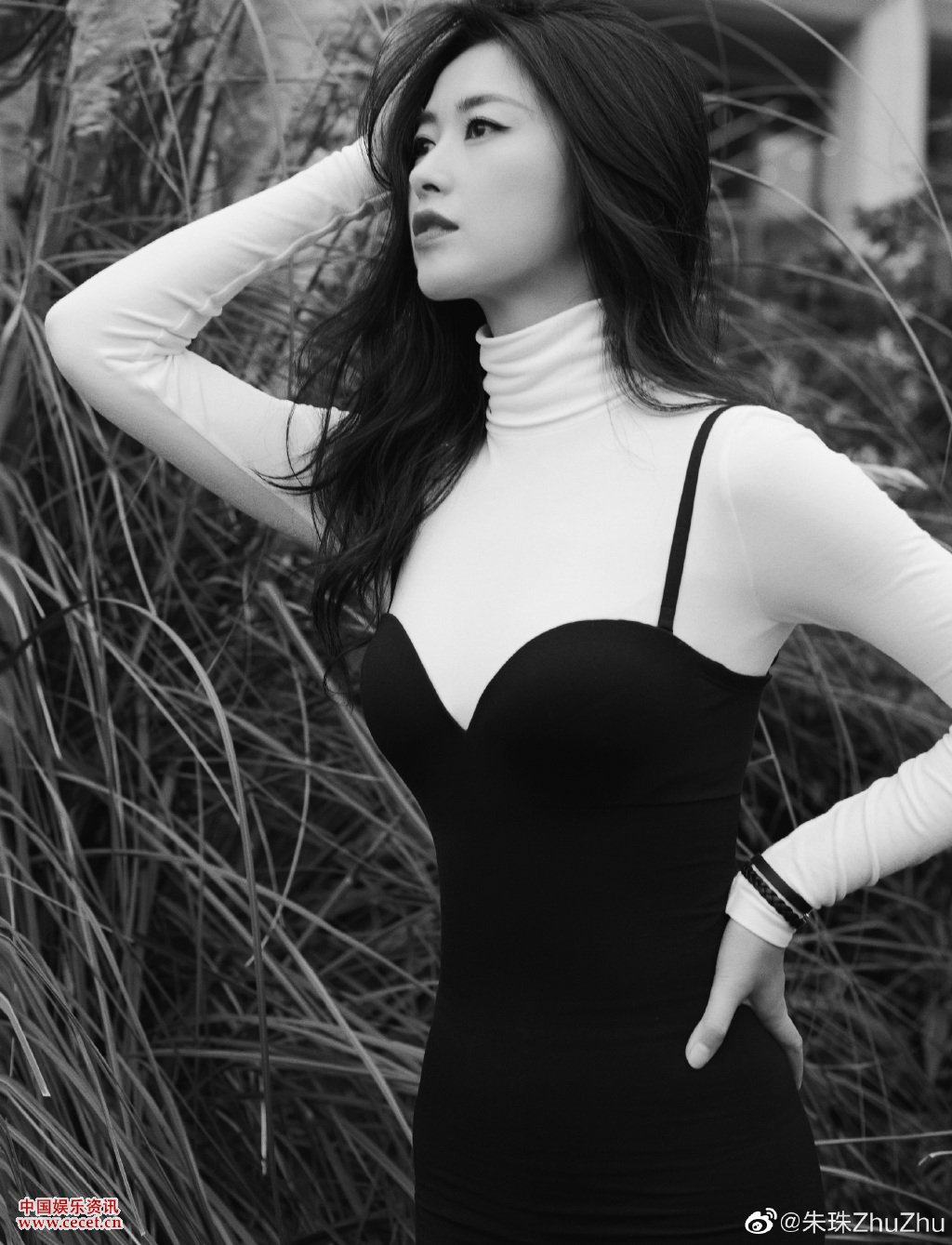 朱珠户外照舒适惬意 侧颜精致曲线玲珑有致